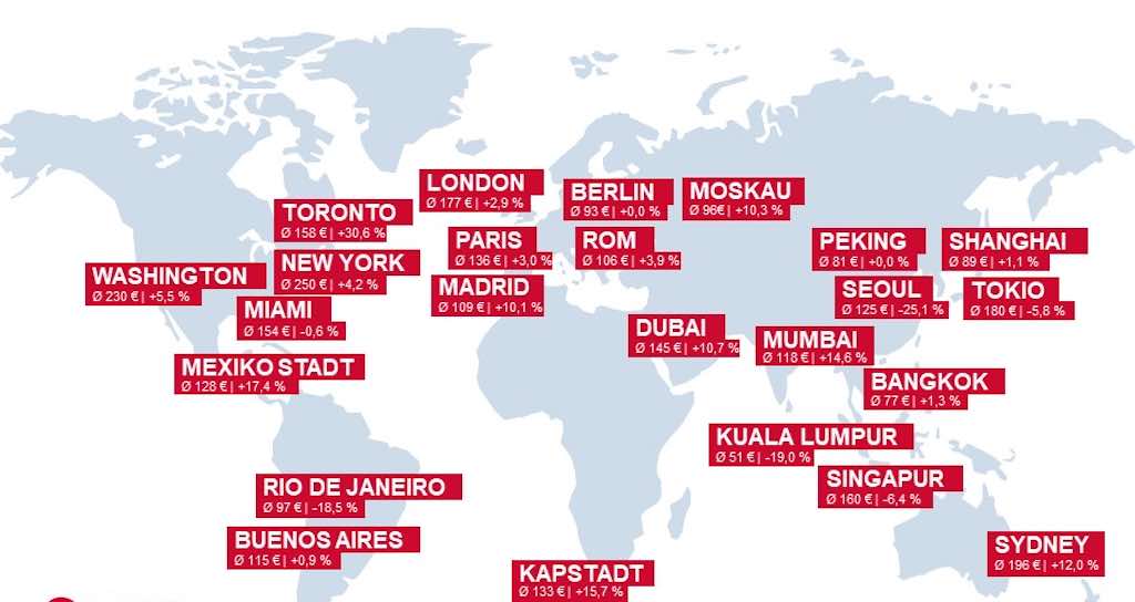 Das stärkste Preiswachstum gab es in Toronto mit 30,6 Prozent auf 158 Euro – Grund dafür könnten die Feierlichkeiten rund um das 150 jährige Jubiläum der Unabhängigkeit Kanadas sein, die rund um Toronto über das ganze Jahr stattgefunden haben.