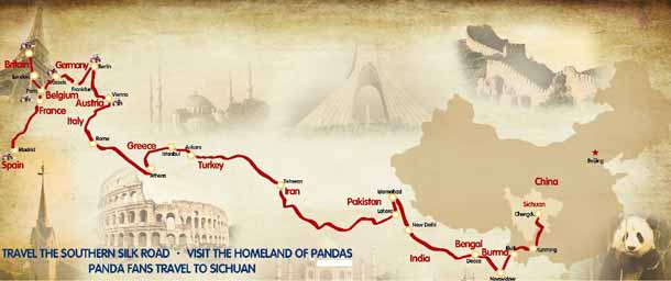Die voraussichtliche Reisedauer wird rund 65 Tage betragen. In der Zeit von April bis Juni 2015 werden auf dem Weg von Europa nach China 15 Länder mit dem Auto bereist werden: England, Frankreich, Spanien, Belgien, Deutschland, Österreich, Italien, Griechenland, Türkei, Iran, Pakistan, Indien, Bangladesch, Burma und China.