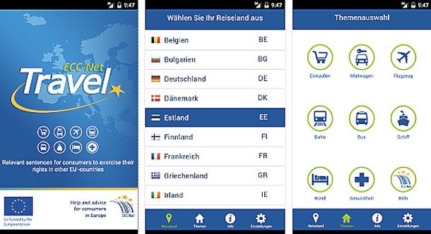 Die „ECC-Net: Travel“ App umfasst das gesamte Netzwerk der Europäischen Verbraucherzentren, das heißt alle 28 EU-Mitgliedsstaaten sowie Norwegen und Island. Bei Reisen in diesen Ländern hilft die App den Konsumenten, sich verständlich zu machen und ihre Rechte einzufordern.