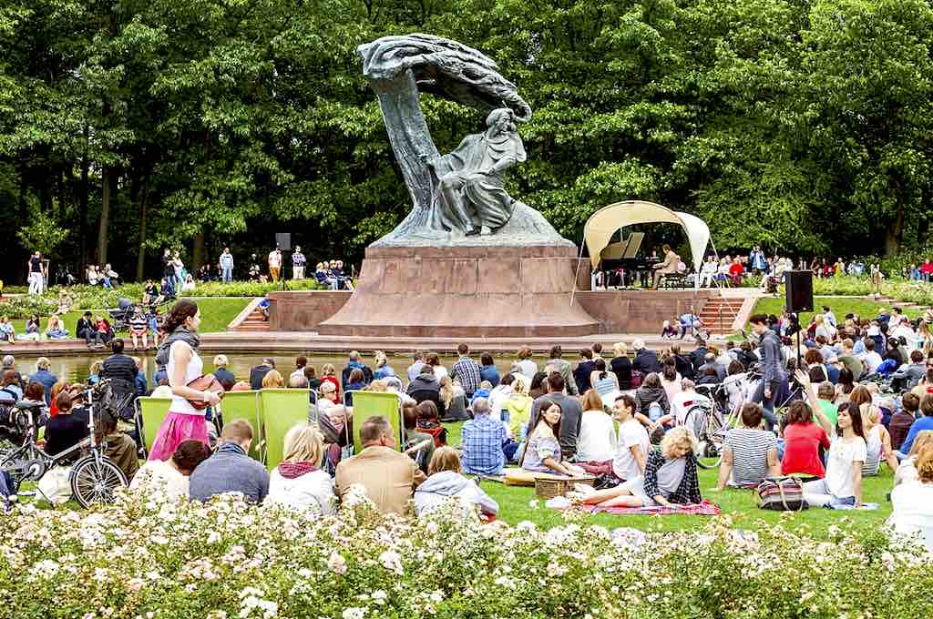 Was du auf keinen Fall verpassen solltest, sind die Chopin-Konzerte im königlichen Lazienki-Park, die internationalen Klavierwettbewerbe, die Festivals oder die einzigartigen Bänke, wo du die berühmtesten Melodien Chopins hören kannst. Komm einfach her, setz dich, und höre dich in die Klänge Warschaus hinein.