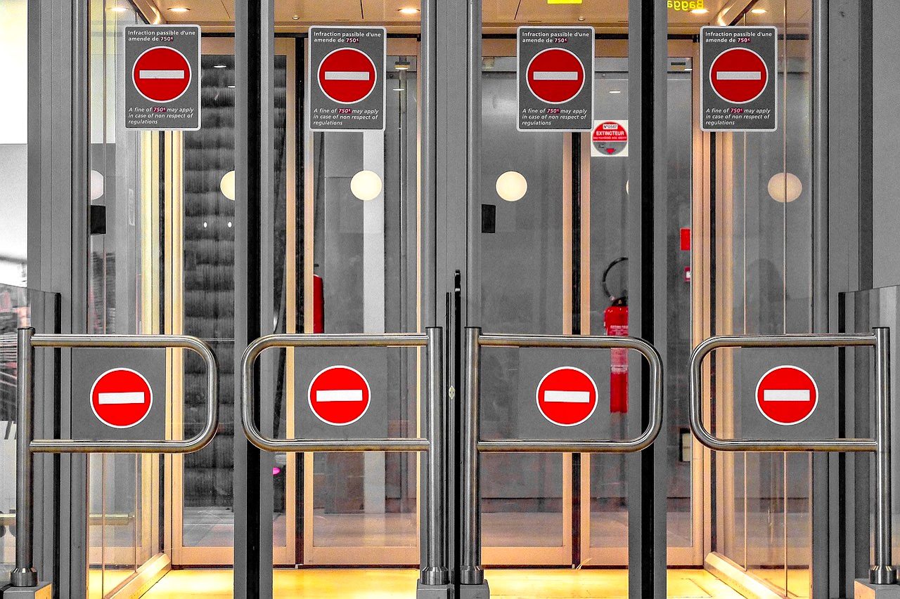 Reisewarnugnen für den nächsten Urlaub: Geschlossene Türen mit einem roten Signal für Einfahrt verboten