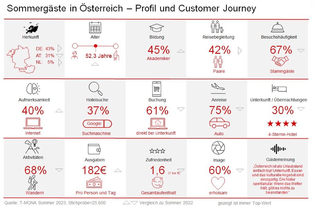 Zwei Drittel der Befragten sind Stammgäste und nur 10 Prozent der Österreich-Urlauber im vergangenen Sommer waren zum ersten Mal in Österreich. Besonders wichtig für das Gastgeberland Österreich: 94 Prozent der Befragten würden ihren Urlaub in der jeweiligen Destination weiterempfehlen.
